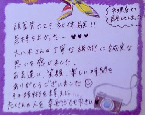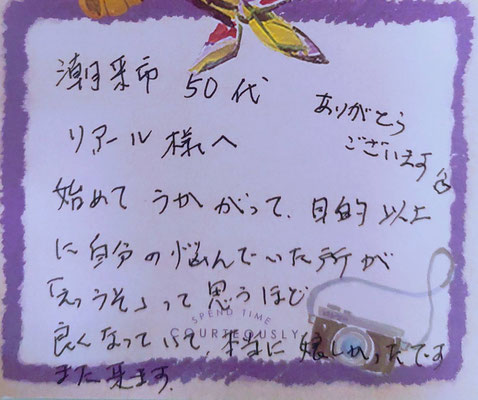 H様、ご感想を有難うございました。施術をさせて頂きながら色々な角度からのお話に発見だらけで思い出すたびワクワクしてます。またお会いできる日を楽しみにしております。